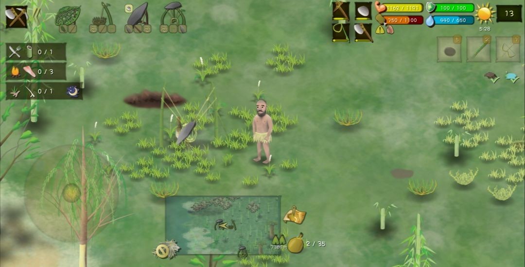 5、捕猎是个技术活游戏中有不少投掷类工具,石头,竹叉,弓箭。有时候你会碰到一些猎物,如草原上的兔子,池塘里的鱼。